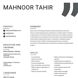 I, Mahnoor Tahir, am a dedicated and responsible tutor with strong subject knowledge and a passion for helping students succeed. I focus on clear explanations, concept building, and creating a positive learning environment to improve students’ confidence and academic performance.